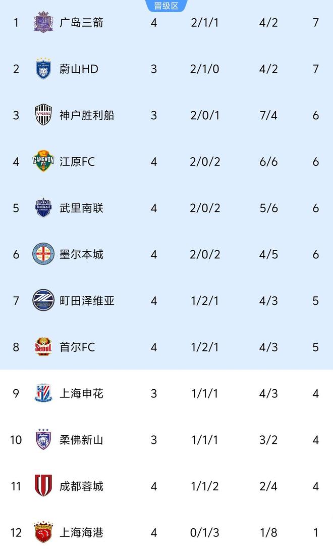 积分榜前列,先战的广岛三箭与蔚山HD同积7分;神户胜利船、江原FC、武里南联、墨尔本城4支球队同积6分,通过净胜球的比拼分列第3到第6。